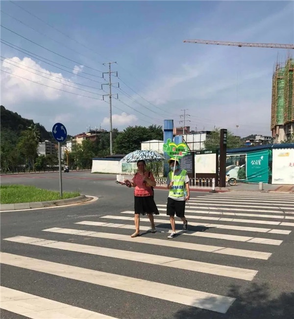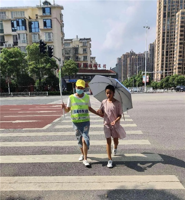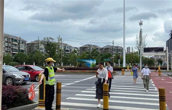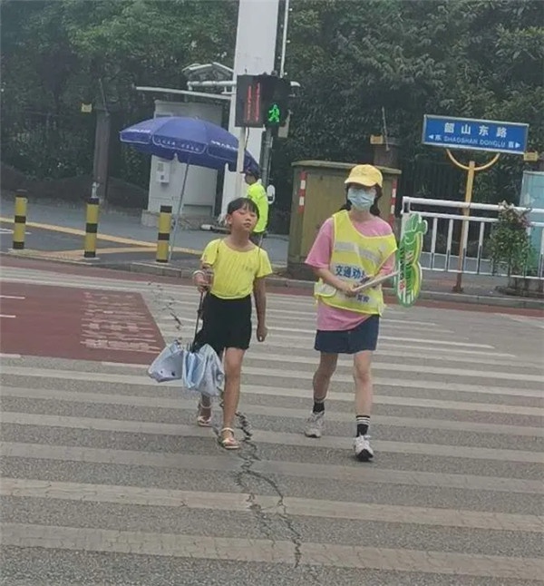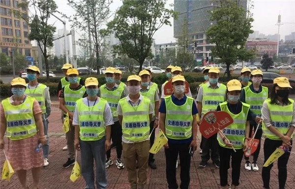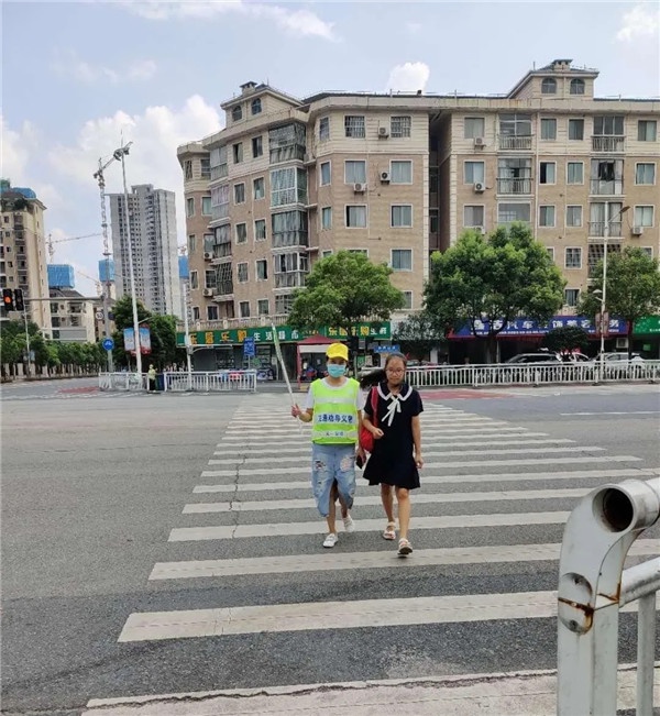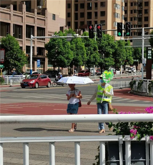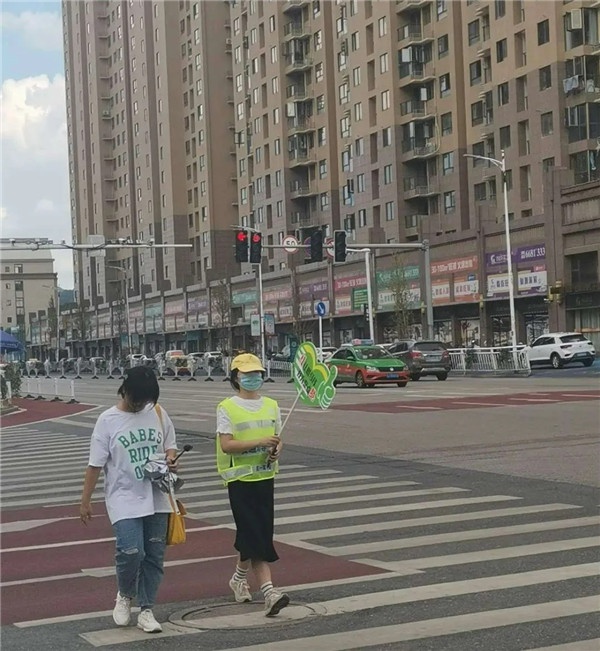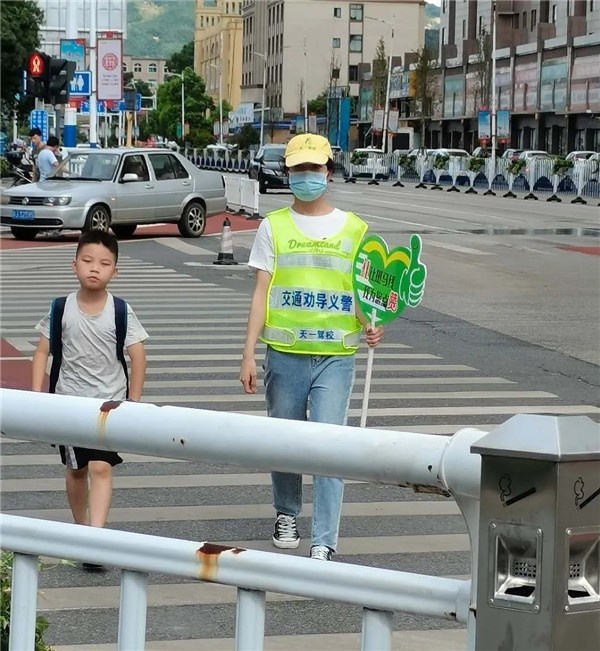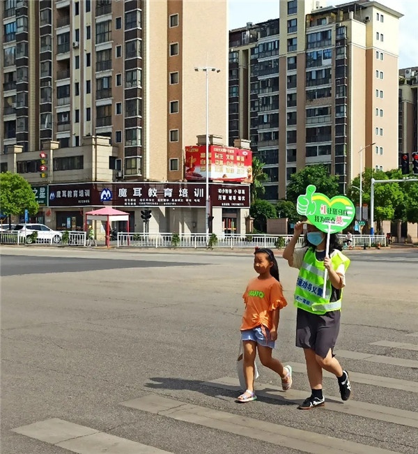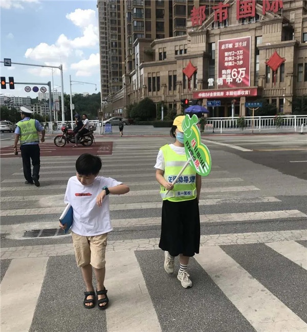在車輛川流不息的城市主干道上,在人來人往的十字路口,時??吹轿覀兲煲粚W(xué)員頭戴小黃帽,身穿熒光背心,那揮動的標(biāo)識成為創(chuàng)建文明城市中一道獨特的風(fēng)景。